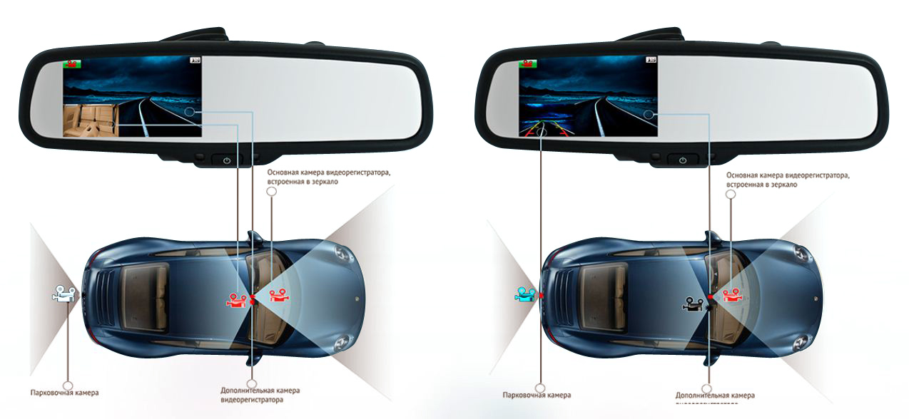 В результате, вы можете подключить к зеркалу DVR-Mirror камеру заднего вида для безопасной парковки и ещё одну камеру для записи событий. Запись при этом ведется одновременно с 2-ух каналов (камера в зеркале и дополнительная) в 2 независимых файла.