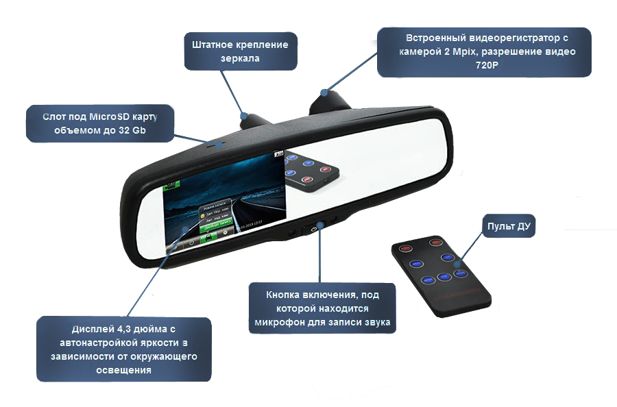 Видеорегистратор. Автомобильный регистратор DVR-MIRROR отличается высочайшим качеством записи, причем, что в дневное, что в ночное время суток. На задней панели зеркала расположен подвижный глазок видеокамеры, который настраивается в двух плоскостях. Отснятый материал записывается на карту памяти формата MicroSD, максимально допустимый объем памяти — 32 GB.