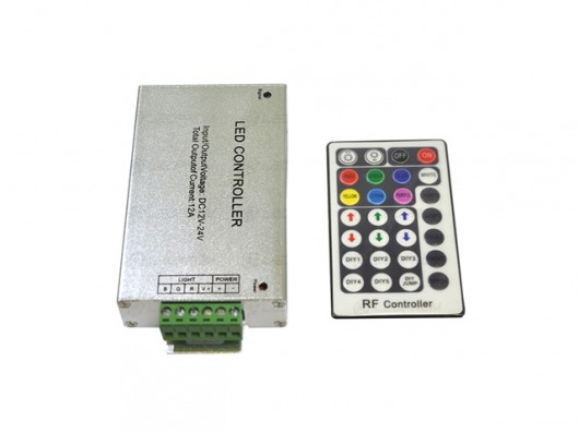 RGB-контроллер RF28K с напряжением 12/24V и мощностью 144/288W позволит вам управлять свечением светодиодной ленты с помощью пульта ДУ по радио-каналу.