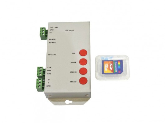 Контроллер PIXEL 2038 с напряжением 7,5-12V и мощностью 1W позволит вам управлять свечением светодиодной ленты. Вы записываете на SD-карту контроллера (128Мб - 2Гб) одну или несколько программ свечения светодиодной ленты. А после — включаете питание, и контроллер воспроизводит выбранную вами программу.