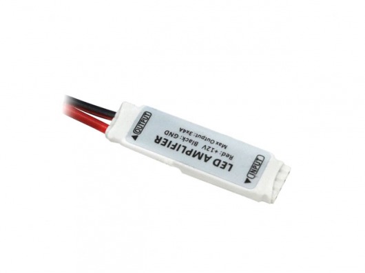 Компактный RGB усилитель A mini позволит "разгрузить" RGB контроллер. Т.е. если мощность необходимого метража ленты превышает допустимую мощность контроллера, то к нему можно подключить усилитель. Таким образом, вы можете подсоединить до 20 метров дополнительной светодиодной ленты.