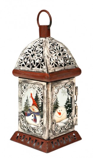 Фонарик рождественский со снеговиками и белой резной крышей (9,5 х 9,5 х 21 см)