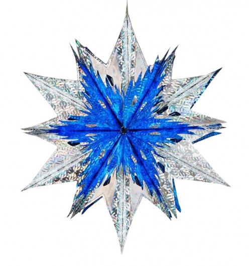 Голографическая сине-серебряная звезда из фольги — прекрасный вариант эффектного и недорогого новогоднего украшения. Новогодняя звезда диаметром 60 см отлично подойдет для украшения уличных елок и просторных помещений. Такая звездочка смотрится очень нарядно, особенно при искусственном свете. А кроме того, она прочная и хорошо хранится, и поэтому будет радовать вас еще много лет.