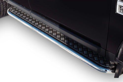 Боковые пороги-подножки сделаны специально для автомобилей Land Rover Discovery IV, поэтому устанавливаются достаточно просто и без повреждений корпуса. Помимо этого, стальные пороги с листом для Ленд Ровер Дискавери 4 смотрятся очень стильно и эффектно. Они добавят вашему авто еще больше солидности и внушительности.