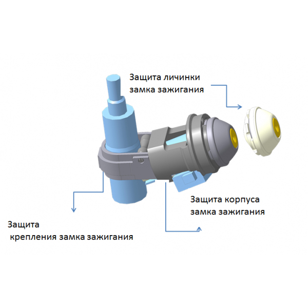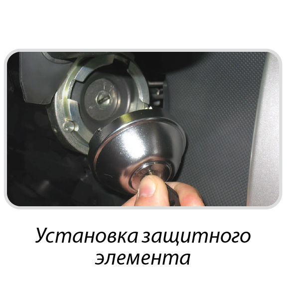 • защита корпуса замка зажигания: металлический кожух монтируется поверх штатного замка зажигания. Благодаря этому замок защищается от ударных нагрузок и механического воздействия.