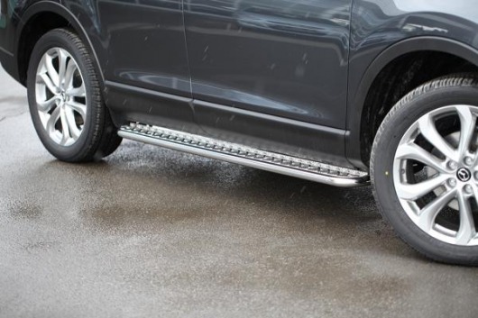 Боковые пороги-подножки сделаны специально для автомобилей Mazda CX-9 от 2013 г.в., поэтому устанавливаются достаточно просто и без повреждений корпуса. Помимо этого, стальные пороги с листом для Мазда СХ-9 смотрятся очень стильно и эффектно. Они добавят вашему авто еще больше солидности и внушительности.