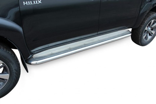 Боковые пороги-подножки сделаны специально для автомобилей Toyota Hilux, поэтому устанавливаются достаточно просто и без повреждений корпуса. Помимо этого, стальные пороги с листом для Тойота Хайлюкс смотрятся очень стильно и эффектно. Они добавят вашему авто еще больше солидности и внушительности.