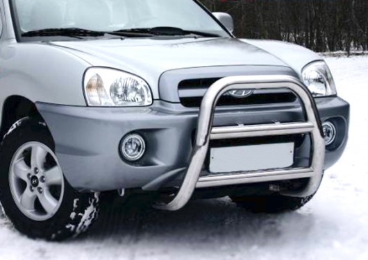 Передняя решетка Hyundai Santa Fe (кенгурятник) – это защитная дуга на бампер из нержавеющей стали диаметром 76 мм.