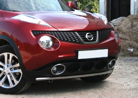 Труба на бампер Nissan Juke защищает передний бампер автомобиля от различных механических повреждений при мелких ДТП и неудачных парковках, а также незаменима при езде по бездорожью. А кроме этого, труба на передний бампер Ниссан Жук смотрится очень стильно и эффектно.