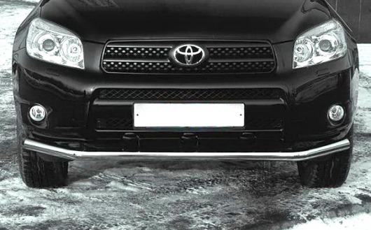 Защита переднего бампера труба предназначена для автомобилей Toyota RAV4 от 2006 г.в. Вам не придется подгонять защиту под размеры бампера вашего авто. И с монтажом проблем не возникнет: установка защиты переднего бампера производится в штатные отверстия, а значит, необходимость сверлить кузов отпадает.