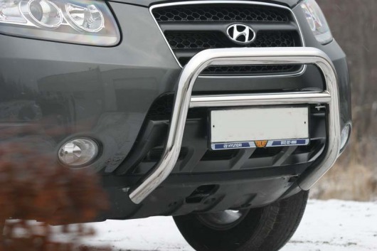 Защитная решетка переднего бампера предназначена для автомобилей Hyundai Santa Fe 2006-2010 г.в. Вам не придется подгонять передний кенгурятник под размеры кузова вашего авто. И с монтажом проблем не возникнет: установка кенгурятника Hyundai Santa Fe производится в штатные отверстия, а значит, необходимость сверлить кузов отпадает.