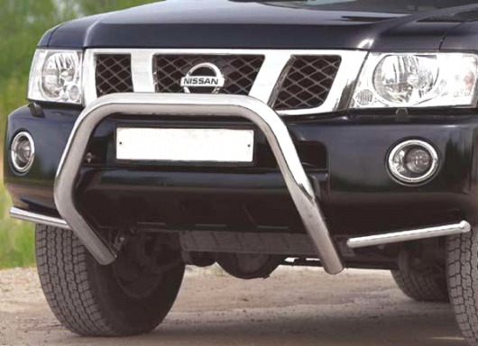 Передняя решетка Nissan Patrol (кенгурятник) – это защитная дуга на бампер из нержавеющей стали диаметром 76 мм.