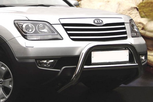 Передняя решетка Kia Mohave (кенгурятник) – это защитная дуга на бампер из нержавеющей стали диаметром 76 мм.
