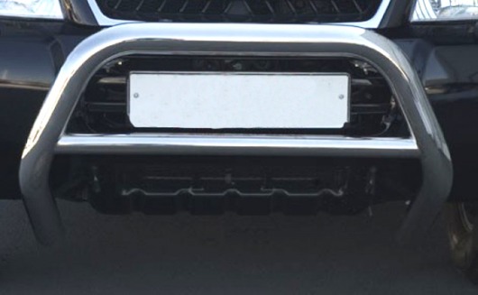 Передняя решетка Mitsubishi Pajero III (кенгурятник) – это защитная дуга на бампер из нержавеющей стали диаметром 76 мм.