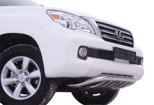 Дуга на бампер Lexus GX460 защищает нижнюю часть переднего бампера автомобиля от различных механических повреждений при мелких ДТП и неудачных парковках, а также незаменима при езде по бездорожью. А кроме этого, нижняя защита переднего бампера на Лексус GX460 смотрится очень стильно и эффектно.