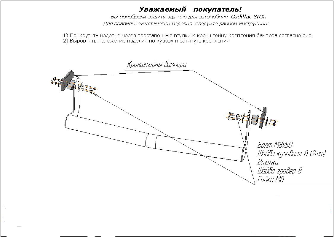 Защита заднего бампера труба предназначена для автомобилей Cadillac SRX 2007-2010 г.в. Вам не придется подгонять защиту под размеры бампера вашего авто. И с монтажом проблем не возникнет: установка защиты заднего бампера производится в штатные отверстия, а значит, необходимость сверлить кузов отпадает.
