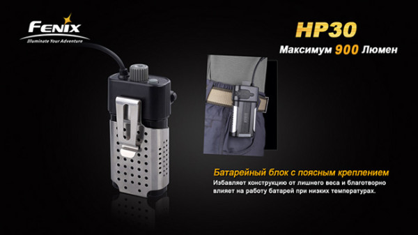 Налобный фонарь Fenix HP30 питается от 2 аккумуляторов 18650 или от 4 батарей CR123A . Выносной батарейный блок крепится отдельно (лучше всего на пояс) и соединяется с налобником с помощью кабеля. У батарейного блока есть целых две замечательные особенности.