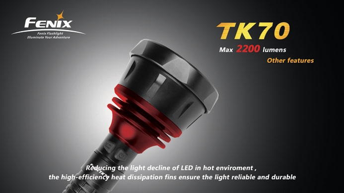 По своей конструкции сверхмощный фонарь TK70 похож на предшественника — TK60. Основное отличие заключается в гораздо более габаритной головной части, поскольку, в отличие от TK60, универсальный фонарь TK70 использует не один, а сразу три светодиода. В результате мощность фонаря почсти втрое больше — 2200 люмен против 800.