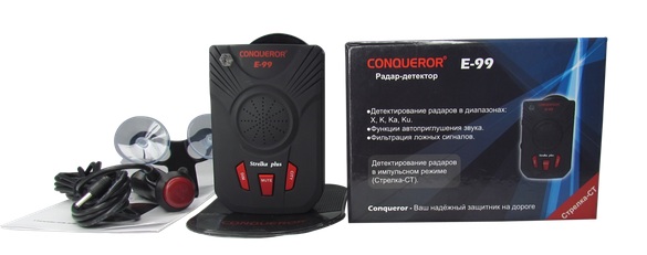 Радар-детектор Conqueror E-99 – современное устройство со всеми функциями, нужными современному водителю. К примеру, радар-детектор отлично справляется даже с обнаружением сигналов «Стрелки-СТ», которую «не видят» другие детекторы.