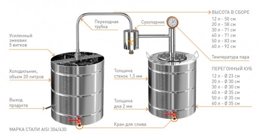 С помощью этого самогонного аппарата большой вместимости с сухопарником и баком на 110 литров вы легко сможете приготовить качественные спиртные напитки в любых условиях, например, на даче или в деревне. Этот аппарат не обязательно подключать к водопроводу: для охлаждения змеевика в нем предусмотрен дополнительный резервуар, который заполняется холодной водой. При этом вам не придется осваивать сложные технологии самогоноварения: достаточно просто залить в бак брагу и поставить аппарат на плиту (подойдет как газовая, так и электрическая плита) или на костер (почему бы и нет?).