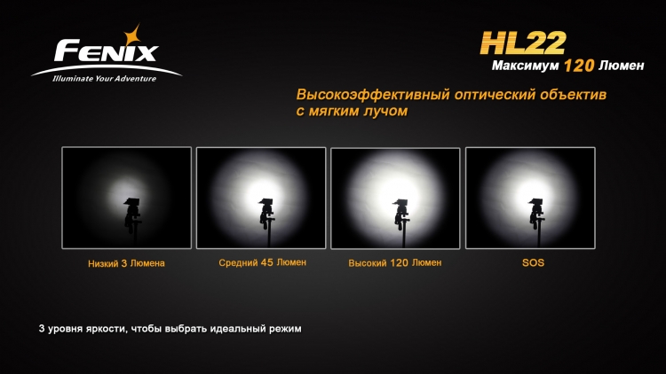 Мощный налобный фонарь FenixHL22 оснащается качественным диодом Creeсо сроком службы до 50 000 часов. Качественный источник свкета и высококлассная оптика позволяет достичь максимальной яркости в 120 люмен и световой луч длиной до 90 метров. Всего же у яркого налобного фонаря 3 основных режима яркости: