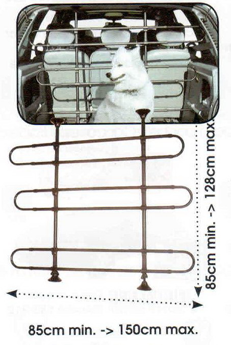 Решетка в машину для собак Green Valley – это оригинальная конструкция, которая представляет собой 2 металлические стойки — распорки между полом и крышей, на которые крепятся 3 овальные секции. Стойки регулируются по высоте (от 85 до 128 см), а секции — по ширине (от 85 до 150 см). Таким образом, разделительная сетка для животных подойдет для багажников любого размера.
