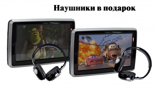 Покупая данный комплект навесных мониторов, вы получите беспроводные двухканальные наушники абсолютно бесплатно, причем сразу 2 пары! Это удобно вдвойне, ведь оба пассажира могут смотреть фильмы или слушать музыку, которая нравится именно им, не мешая друг другу и водителю.