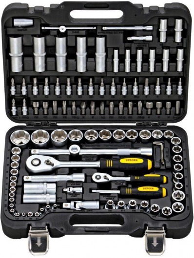 BERGER BG108-1214 — это набор инструментов в чемодане, который содержит в себе 108 предметов: торцевые головки разных размеров, трещоточный ключ с 45-ю зубьями, шестигранные ключи, биты разного вида и многое другое (просмотреть весь список).