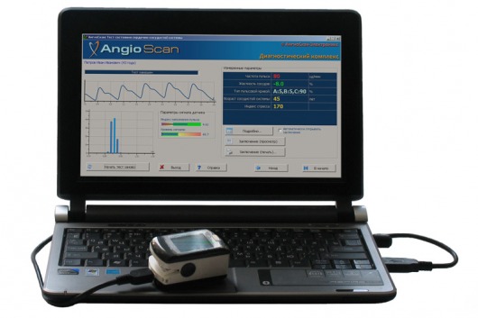 Сканер сосудов Ангиоскан-01П применяется в домашних условиях для персонального мониторинга сердца, Прибор обеспечивает измерение многих показателей, среди которых пульс, содержание в крови кислорода, эластичность сосудов и уровень стресса.