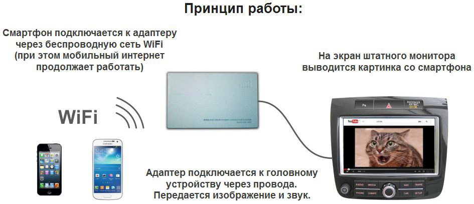 AirPlay. Используется, если вы хотите вывести звук и картинку с iPhone или iPad на штатный монитор в автомобиле. Адаптер передачи картинки совместим со всеми версия iOS. В настройках iPhone'а выбираете WiFi, находите точку доступа (адаптер) и подключаетесь к ней. Потом выбираете в телефоне AirPlay, ставите опцию "Видео повтор".