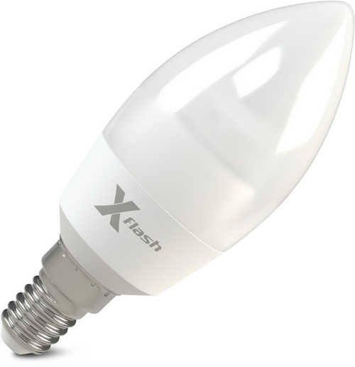 Светодиодная лампа X-Flash Candle E14 отлично подходит для общего и декоративного освещения. Колба светодиода матовая, выполнена в виде пламени свечи. Светодиодная лампа соответствует по форме, цоколю и размерам аналогичным компактным люминесцентным лампам и лампам накаливания. Может применяться в любых светильниках с цоколем типа «миньон». Данная модель рассчитана на напряжение 220 В. Мощность диодной лампы X-Flash — 6,5 Вт., яркость —520Лм, угол освещения лампы более 270 градусов, а температура свечения – 4000 K (это белый свет).