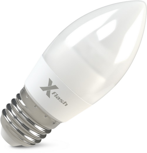 Светодиодная лампа X-Flash Candle E27 с колбой матового цвета, выполненной в форме пламени свечи предназначается для общего и декоративного освещения. Светодиодная лампа соответствует по форме, цоколю и размерам аналогичным компактным люминесцентным лампам и лампам накаливания. Может применяться в любых светильниках с цоколем типа «миньон». Данная модель рассчитана на напряжение 220 В. Мощность диодной лампы X-Flash — 6,5 Вт., яркость —520Лм,  угол освещения лампы более 270 градусов, а температура свечения – 4000 K (это белый свет).