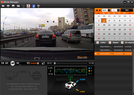 MiVue Manager — программа для просмотра и управления данными. С ней удобно не только просматривать видео, но и делиться видеороликами в соцсетях и даже наблюдать за направлением движения автомобиля во время экстренных ситуаций.