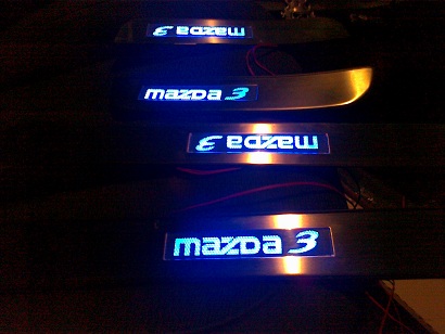 Светящиеся накладки на пороги Mazda 3 не входят ни в одну комплектацию этой модели автомобиля. Они позволят вам сделать свой автомобиль еще более оригинальным и стильным. Каждое открытие двери будет сопровождаться теплым синим или красным светом.