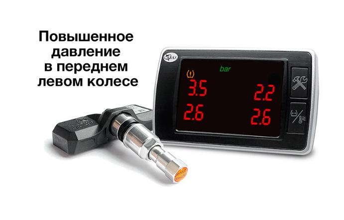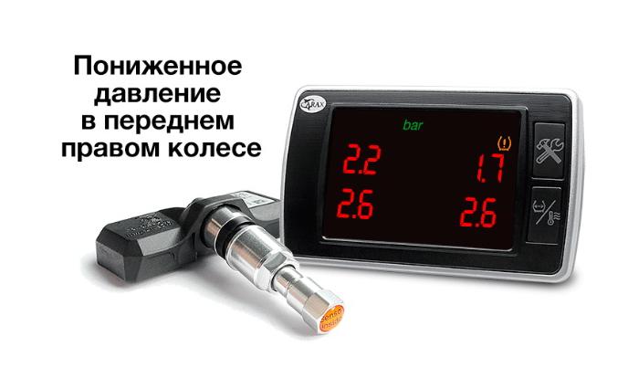 Оповещение звуковым и световым сигналами. Когда давление и температура одного из колес выходит за установленные вами пределы, система предупреждает вас звуковым сигналом, а также подсвечивает цифру проблемного колеса на экране. Принцип работы: