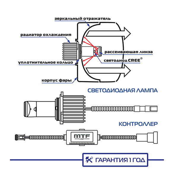 Автомобильная светодиодная лампа MTF Light устанавливается в противотуманные фары. Эта лампа отличается уникальной запатентованной линзой рассеивания, которая позволяет максимально повторить световой пучок галогенной лампы и при этом добиться устойчивого светового потока яркостью в 600 люмен.