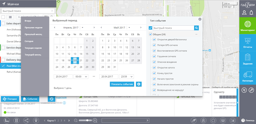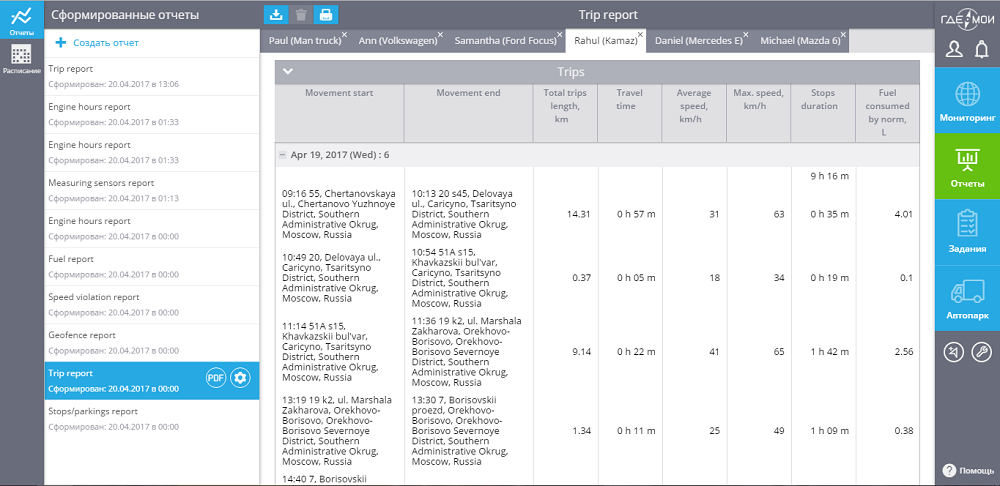 Вы можете определять как длину отдельных поездок, так и пробег за определенный период. Благодаря этому вы можете видеть транспорт, который находится на рейсе, и контролировать моточасы (рабочее время водителей авто), тем самым контролируя и производительность всего автопарка.