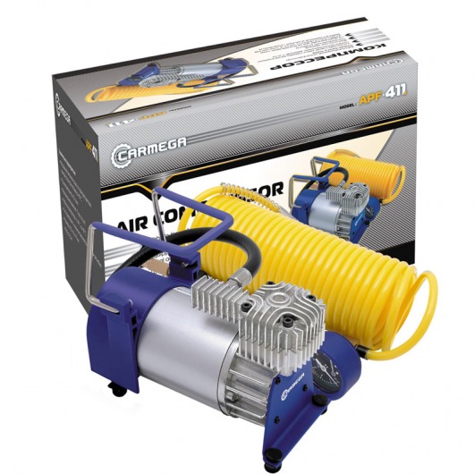 Carmega APF-411 — автомобильный компрессор поршневого типа, который вы можете использовать для накачки шин любых транспортных средств, в том числе внедорожников и малых грузовиков. Автокомпрессор Carmega APF-411 оснащен шлангом-спиралью длиной 7.5 м, что позволяет вам, не меняя точки подключения компрессора, протянуть шланг к колесам крупногабаритного транспорта. Шланг снабжен манометром для контроля процесса накачки и специальным клапаном «дефлятором» для стравливания излишнего воздуха в шине.