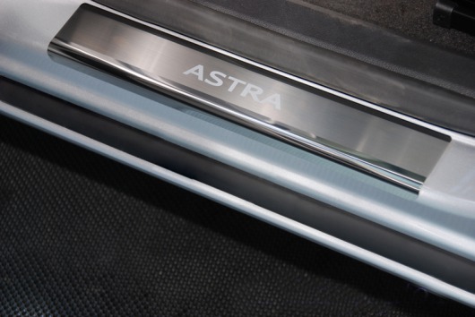 Внутренняя накладка на порог Opel Astra  — это аксессуар автомобильного тюнинга, который защищает внутренний порог от механических повреждений при посадке и высадке из машины. Декоративные накладки с рисунком на внутренние пороги предназначены для автомобилей Opel Astra 3D от 2007 г.в.
