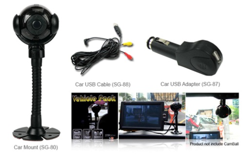 Vehicle Pack Camball  - это специальный комплект аксессуаров для использования миниатюрной камеры Safebox Camball SG-31 в автомобиле в качестве  видеорегистратора. Комплект включает в себя набор следующих приспособлений: автомобильное крепление, USB кабель, адаптер для прикуривателя и USB.