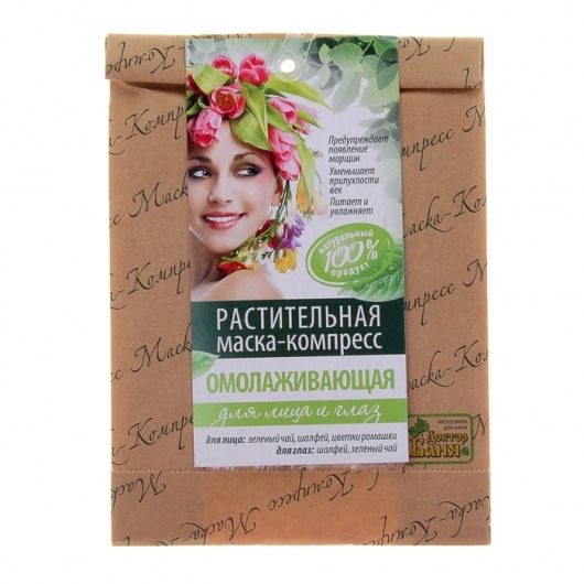 Растительная маска-компресс для лица и глаз полностью покрывает лицо. Для дыхания предусмотрена специальная прорезь. Состав: для лица – зелёный чай, шалфей, цветки ромашки; для глаз – шалфей, зелёный чай. Отборные травы высшего качества, экологически чистый и натуральный продукт.