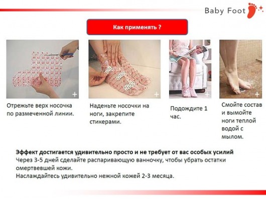 Поцедура Baby Foot совершенно безболезненна и очень проста: нужно надеть одноразовые носочки на 1 час, при этом можно ходить и заниматься привычными делами. Затем нужно снять носочки и тщательно сполоснуть ноги. Вы будете приятно удивлены, насколько незаметно проходит процедура! В течение 3-5 дней после применения Baby Foot будет происходить постепенное отшелушивание омертвевших клеток кожи.