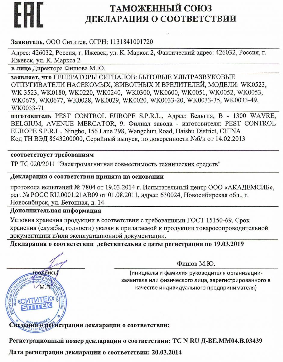 Отпугиватель прошел необходимые проверки и соответствует требованиям Таможенного союза