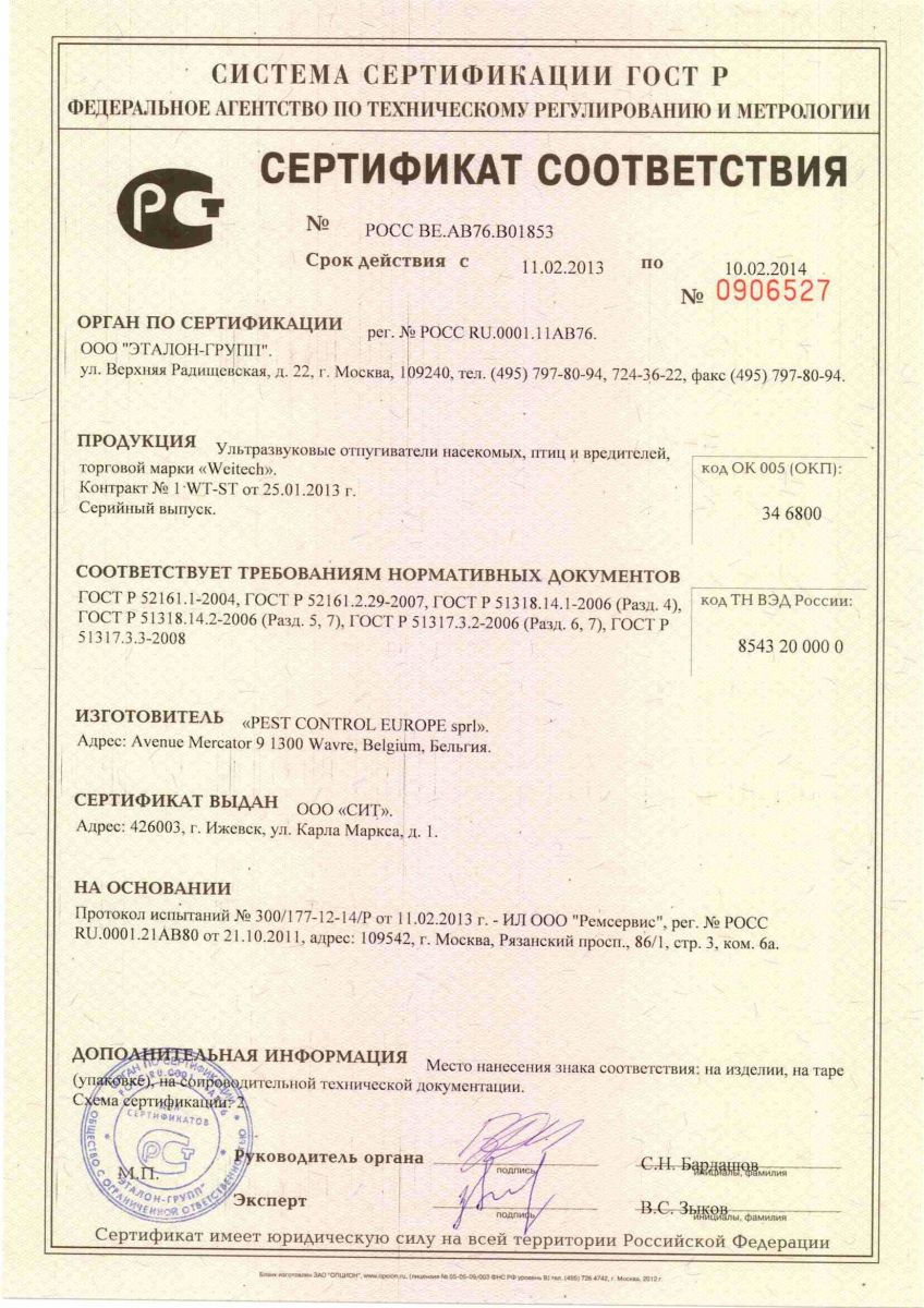 Отпугиватель прошел необходимые проверки и соответствует требованиям Таможенного союза