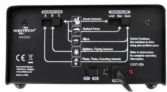 Устройство имеет 9 режимов работы. Подбирайте наиболее оптимальную частоту и мощность излучения для отпугивания конкретных вредителей. Для этого сзади прибора имеется два переключателя — "Громкость звукового излучения" (Sound volume) и "Звуковой рисунок" (Sound pattern). Каждый из них имеет 3 положения, комбинируя которые, можно выбрать один из девяти режимов.