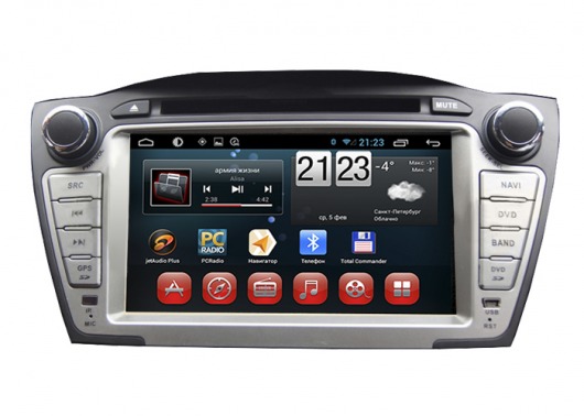 Штатное головное мультимедийное устройство позволяет прослушивать аудиофайлы различных форматов, просматривать видео (в том числе в HD-формате) и фотографии как с внутренней памяти устройства (8 Гб), так и с внешних носителей и SD карт памяти. Вы также можете слушать аналоговое или интернет-радио или смотреть видео онлайн. Или подключить цифровой ТВ-тюнер, чтобы смотреть цифровые каналы прямо на экране устройства. А еще у вас есть возможность подключить DVD-привод и смотреть фильмы и управлять DVD-меню прямо с сенсорного экрана магнитолы.