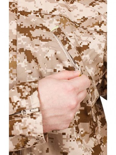 4 кармана на куртке: 2 нагрудных скошенных на молнии, 1 прорезной на молнии на левом рукаве и 1 объемный с клапаном на правом рукаве для телефона/рации; 2 многофункциональных накладных кармана на брюках.