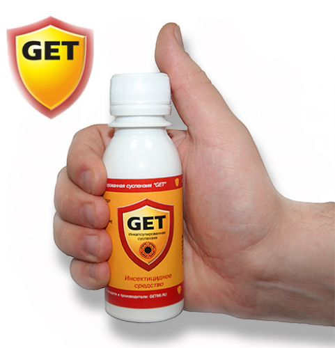 Основное преимущество инсектицида GET по сравнению с аналогичными препаратами заключается в особой технологиии производства, при котрой действующее вещество помещается в полимерные микрокапсулы. При этом инсектицид содержится внутри капсулы, а не снаружи, не имеет резкого химического запаха и абсолютно безвреден для людей. И главное — остаточное действие у этого препарата длится до полугода, так что на 6 месяцев можно забыть о насекомых, и только потом провести повторную обработку, если потребуется.