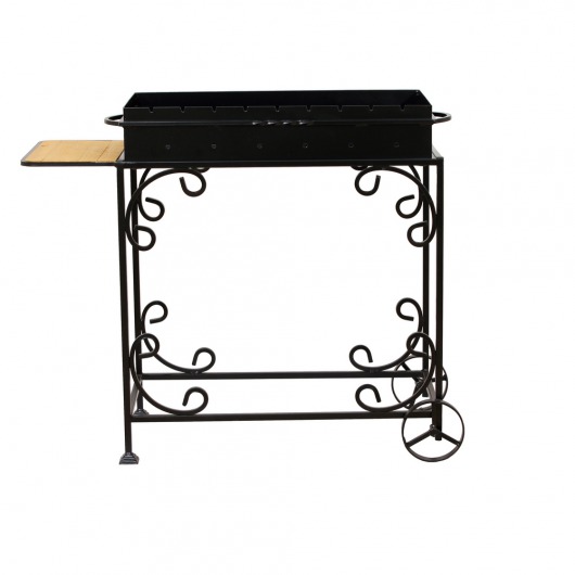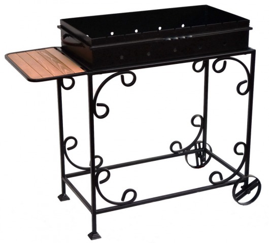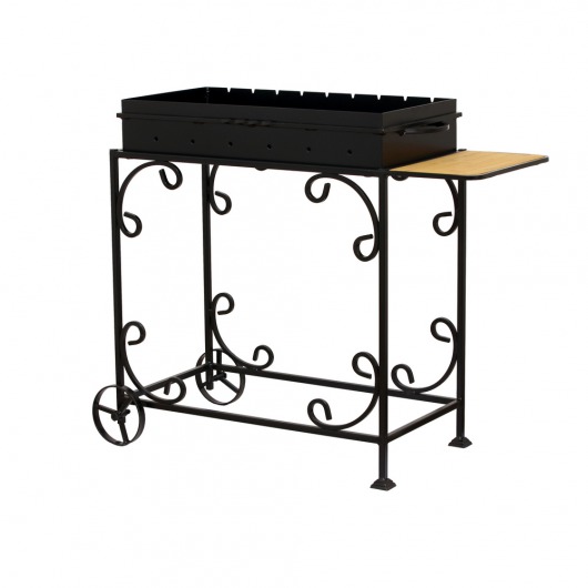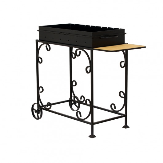 И это не единственные преимущества дачного кованого мангала МС-4С. Несмотря на изящность и компактность, его конструкция отличается особой прочностью. Стойка усилена элементами ручной ковки, а ящик мангала изготовлен из цельного листа жаростойкой стали толщиной 2 мм на гидравлическом прессе. Такая жаровня выдерживает высокие температурные нагрузки в течение долгого времени и не деформируется. А сбоку от жаровни расположился небольшой удобный деревянный столик, который можно использовать как подставку для посуды или вместо разделочной доски.
