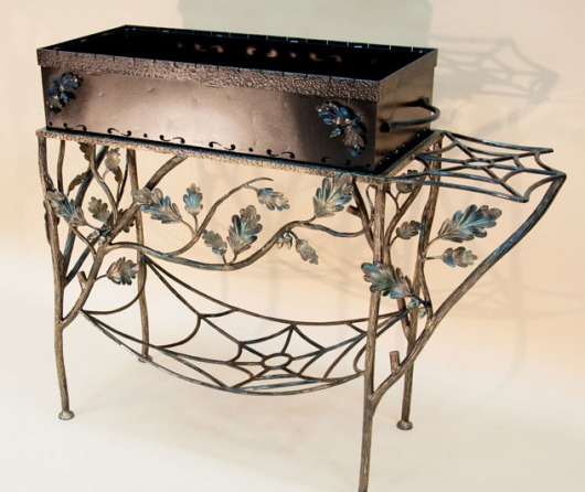 И это не единственные преимущества дачного кованого мангала М2. Несмотря на утонченность и компактность, его конструкция отличается особой прочностью. Стойка усилена элементами ручной ковки, а ящик мангала изготовлен из жаростойкой стали толщиной 4 мм, которая выдерживает высокие температурные нагрузки в течение долгого времени и не деформируется. Сбоку от жаровни располагается металлический столик для посуды.